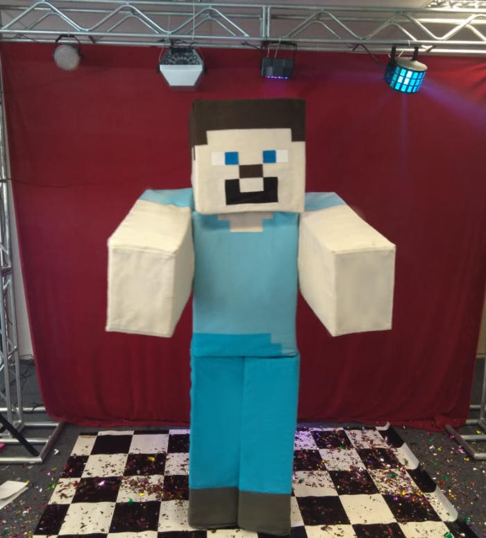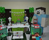 O tema Minecraft traz o personagem Steve para animar a festa, dançando e divertindo bastante a todos os convidados.