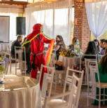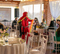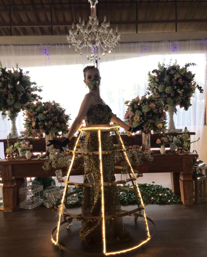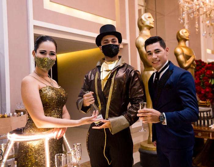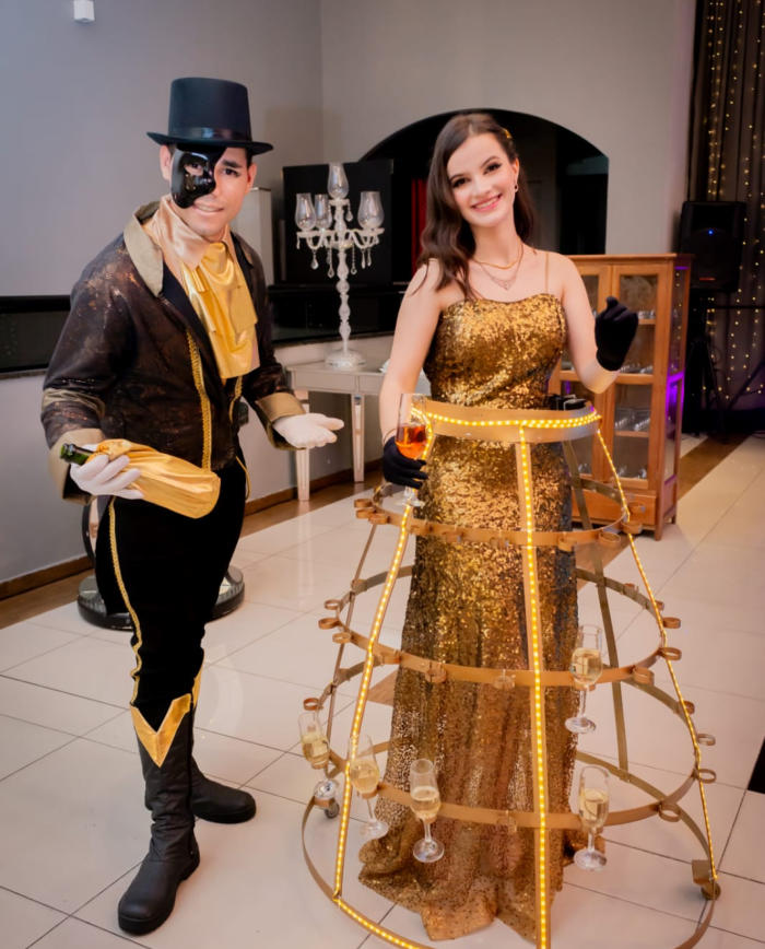 de taças luxuosa para recepcionar os convidados. Ambos interagem com os convidados de maneira extrovertida