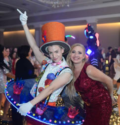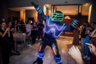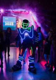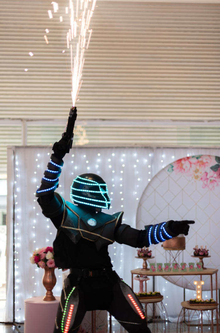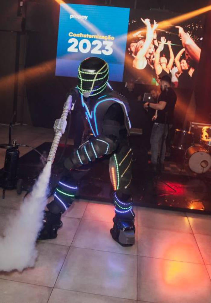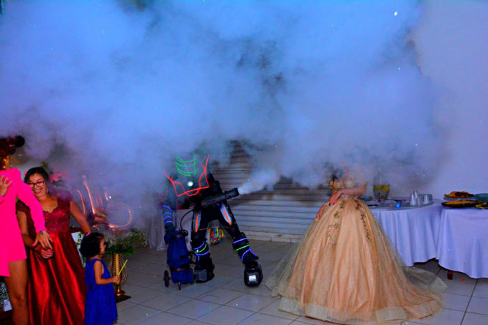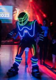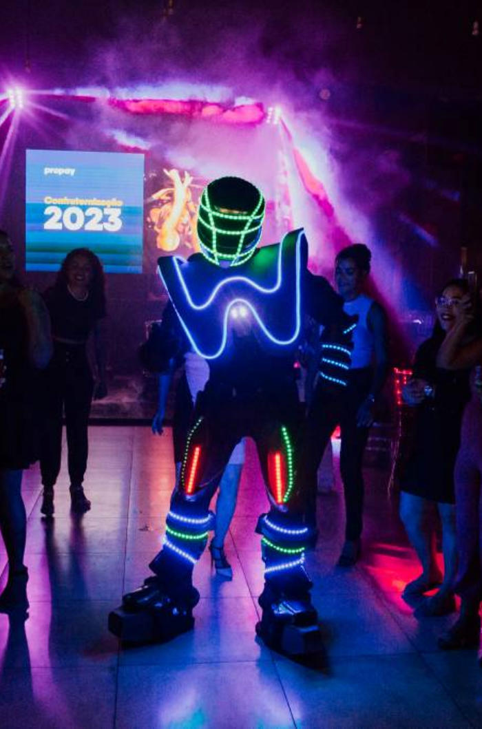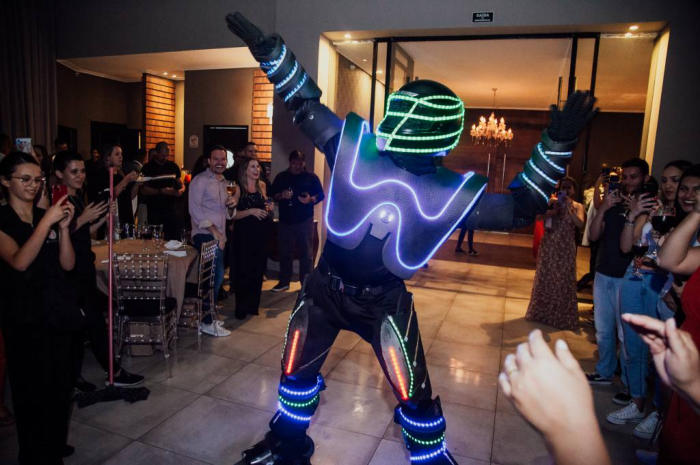 Com 1.90 de altura, o Robozinho de Led anima a pista de dança, dançando com os convidados e dando atenção
